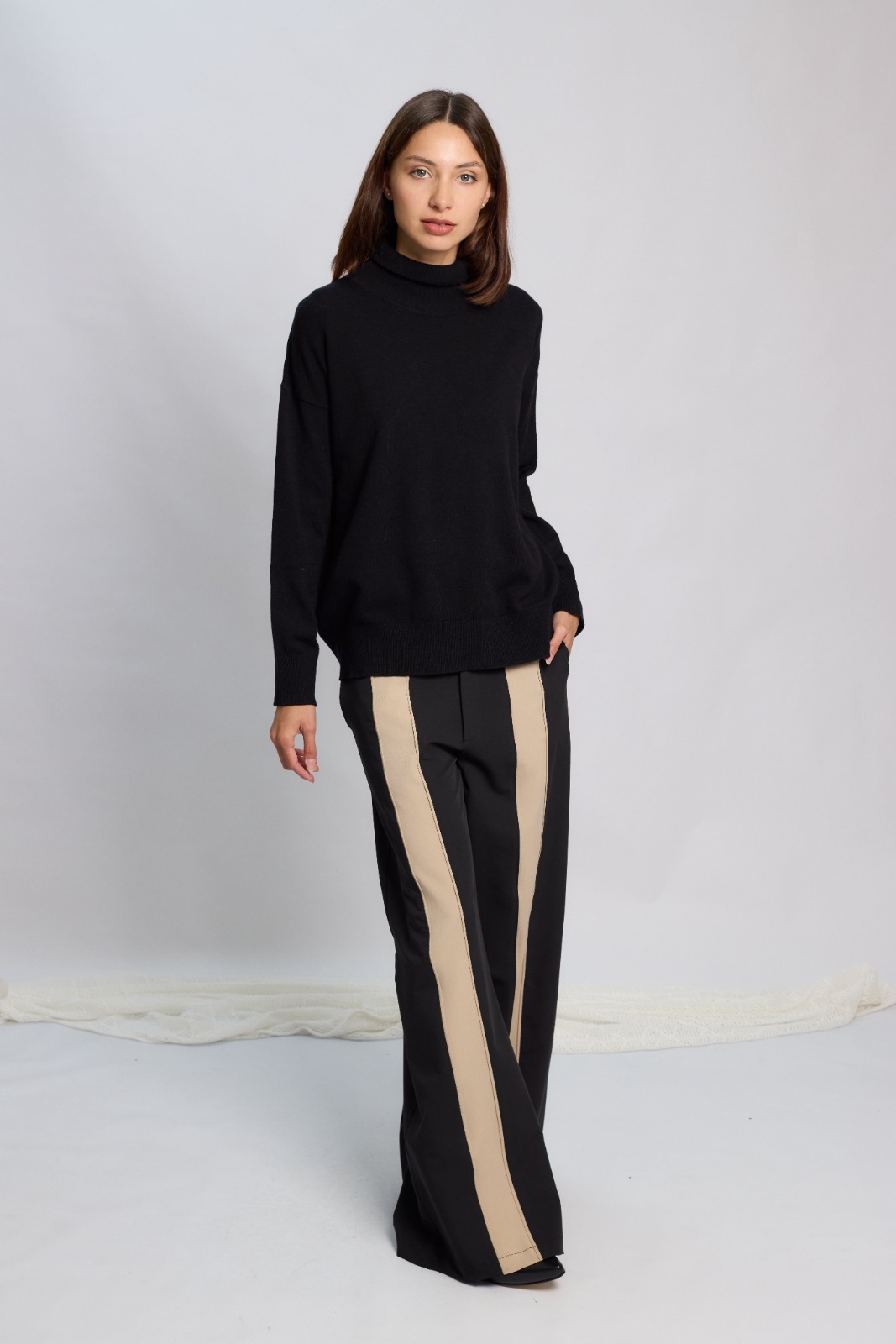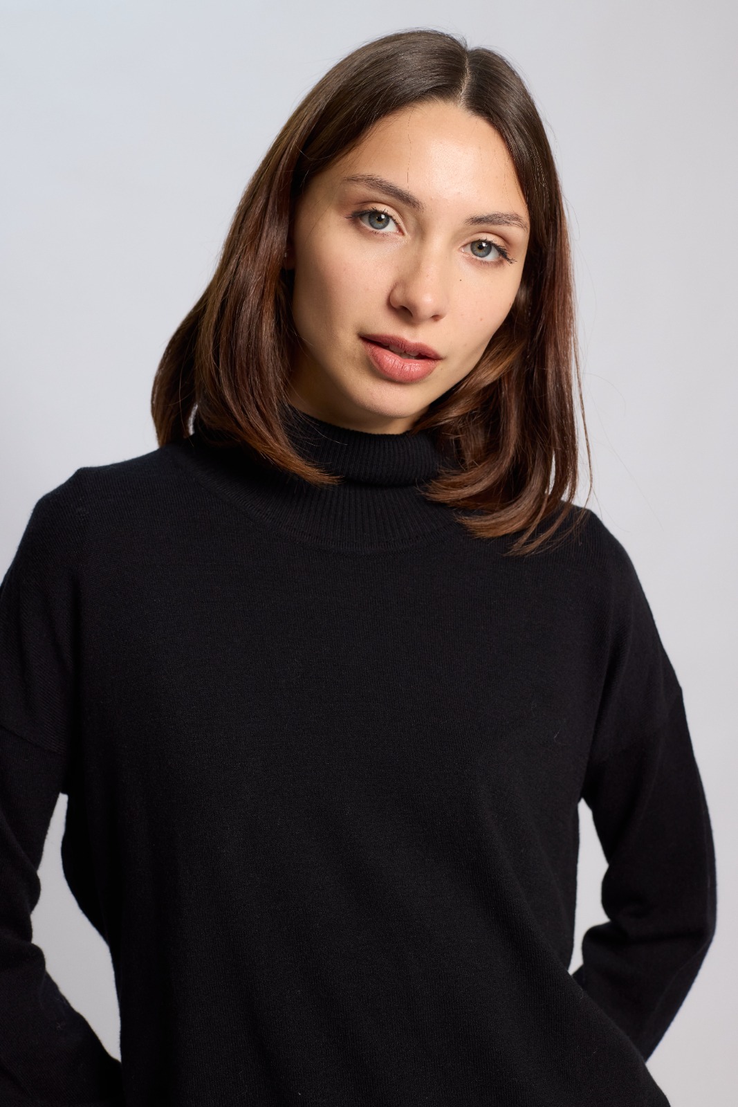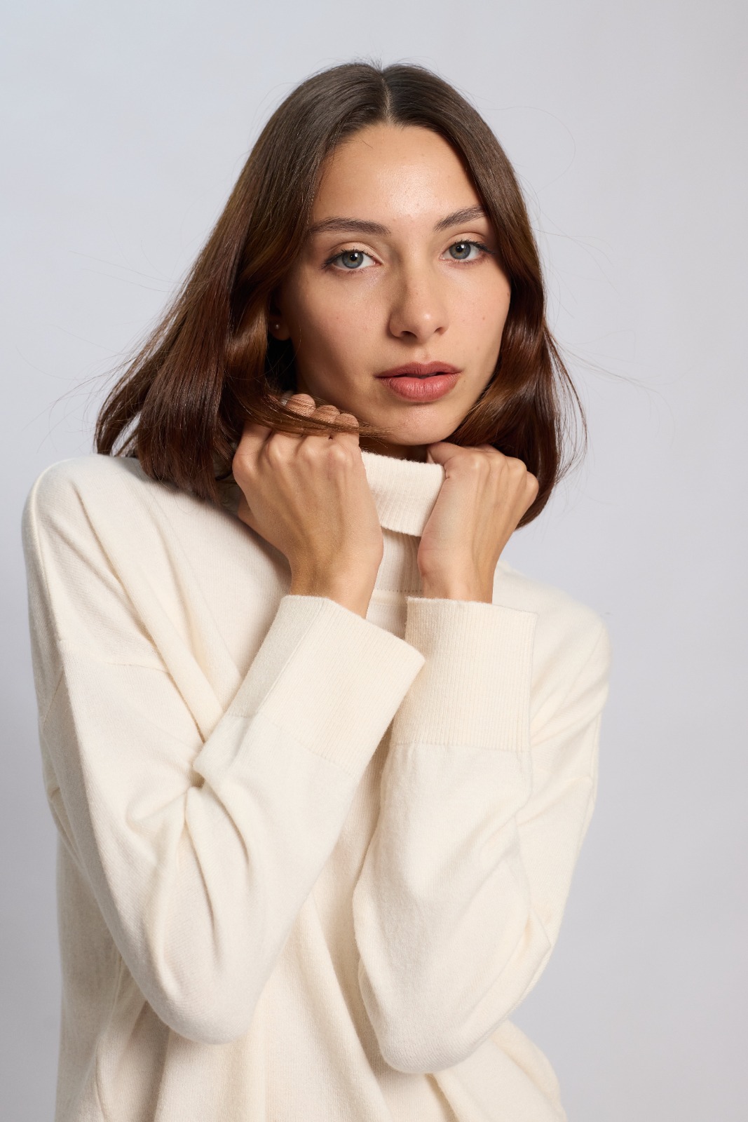 El cuello alto suave, de estructura flexible, envuelve el cuello con delicadeza, aportando protección y una sensación de contención. Las mangas largas rectas refuerzan su impronta clásica y atemporal, mientras que el tejido ligero suma calidez sin peso visual.