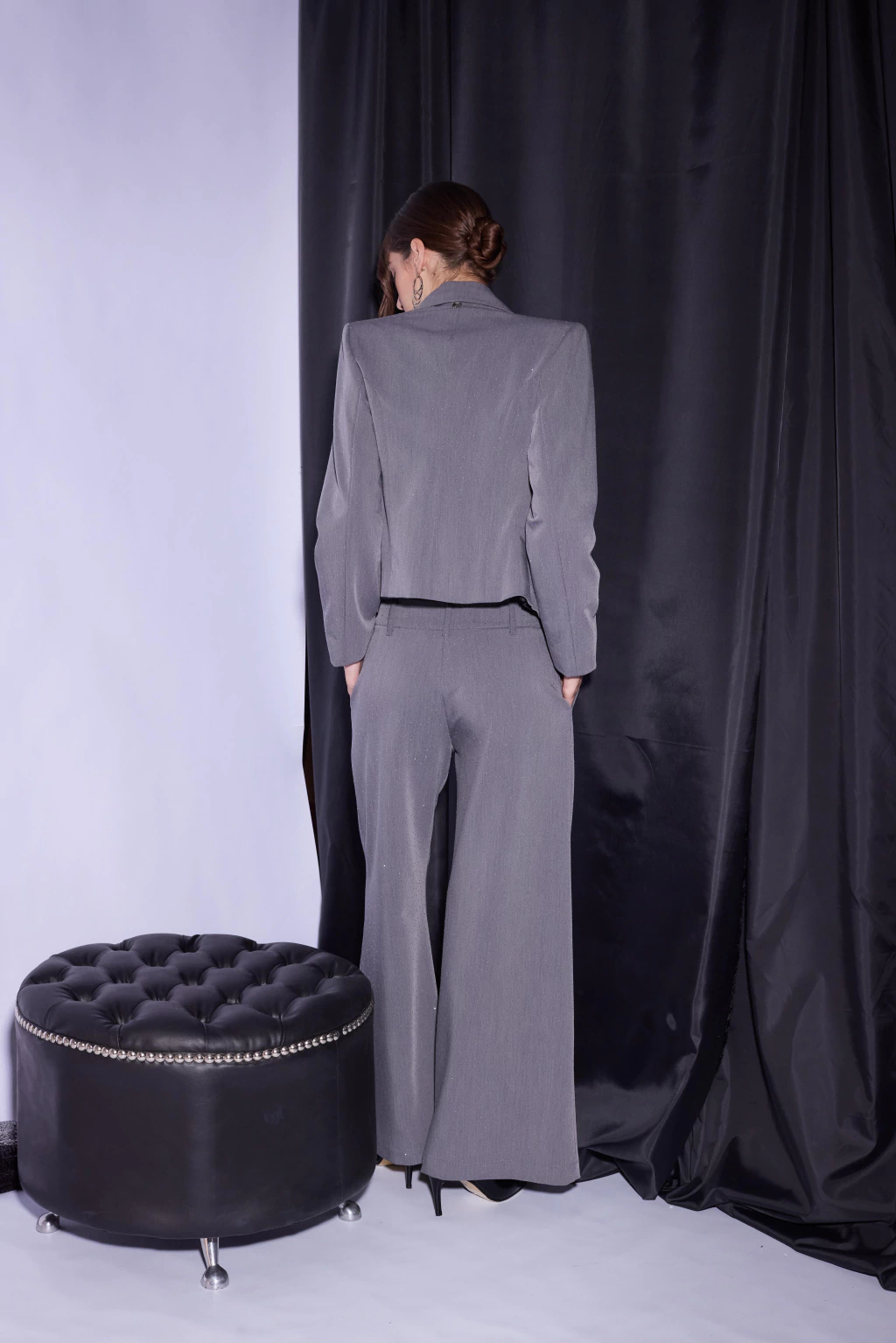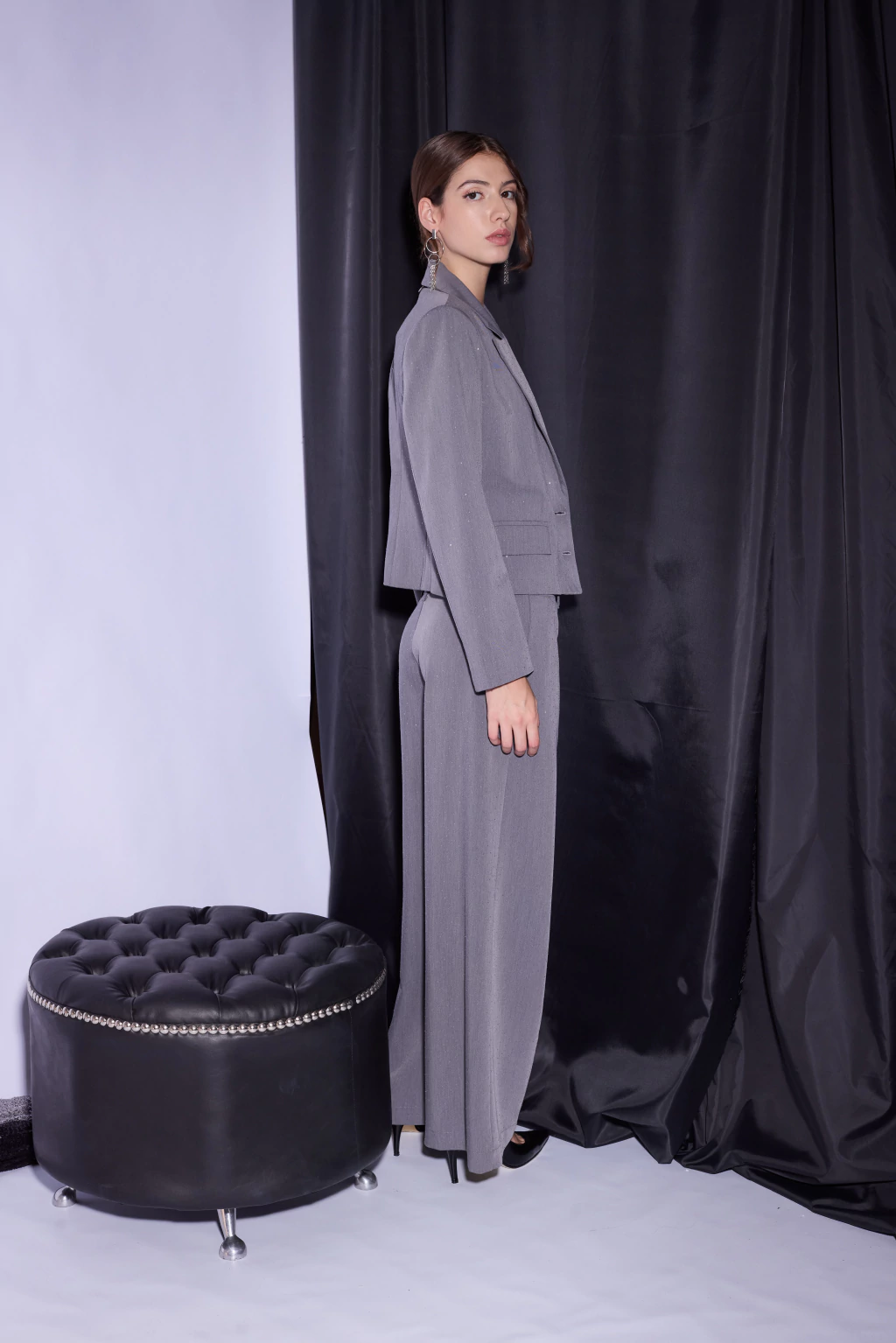 El Saco Cuarzo es un blazer sastrero cropped en tono gris con micro brillo integrado. De corte estructurado y largo a la cintura, presenta solapa, hombros levemente marcados y mangas largas clásicas rectas. Su trama brillante aporta un brillo sutil que eleva cualquier look.